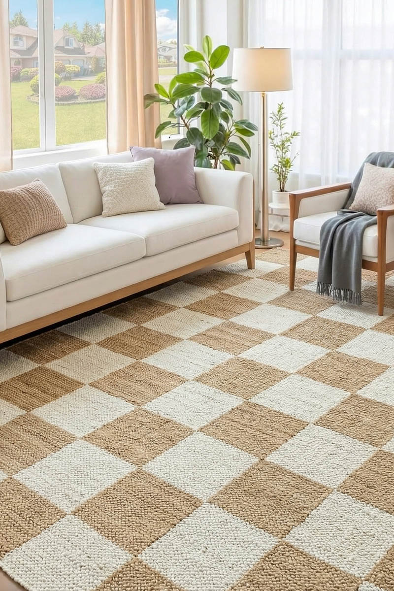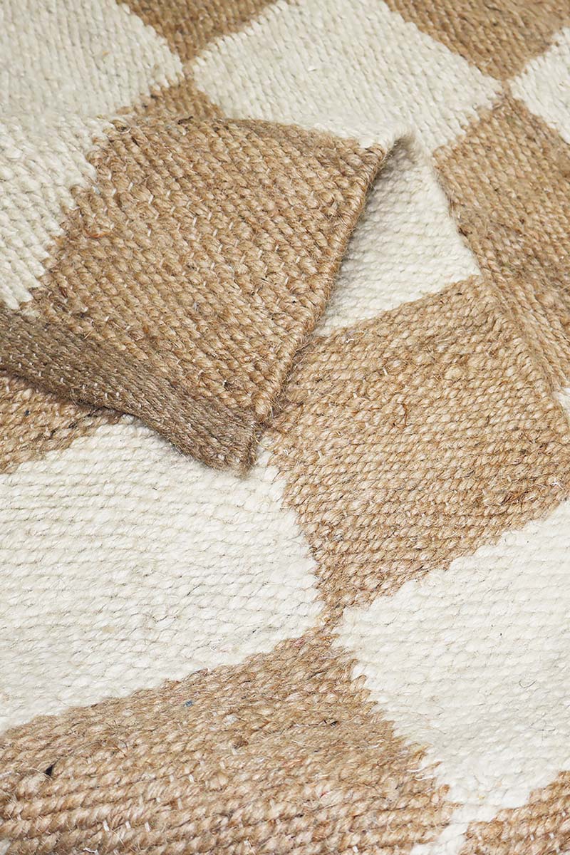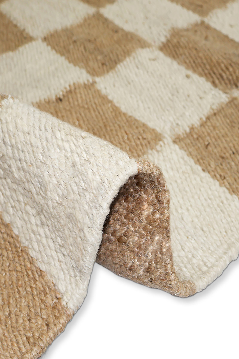 Add bold elegance to your space with this striking Beige and ivory checkerboard Hand Woven Rug. . Expertly crafted from premium natural fibers using traditional techniques, this reversible Modern Boho Dhurrie offers excellent durability and artisanal texture for high-traffic areas.