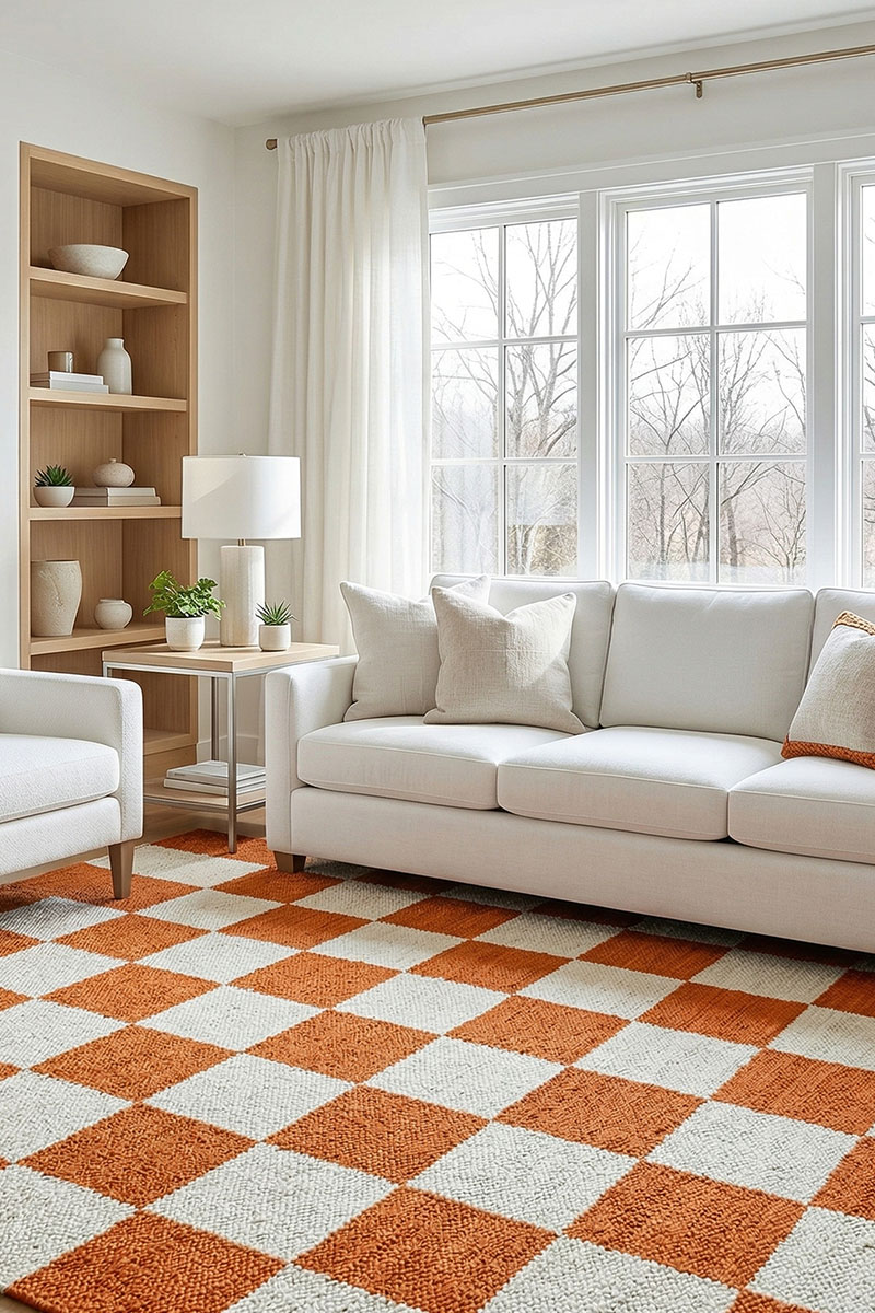 Add bold elegance to your space with this striking Orange and ivory checkerboard Hand Woven Rug. . Expertly crafted from premium natural fibers using traditional techniques, this reversible Modern Boho Dhurrie offers excellent durability and artisanal texture for high-traffic areas.