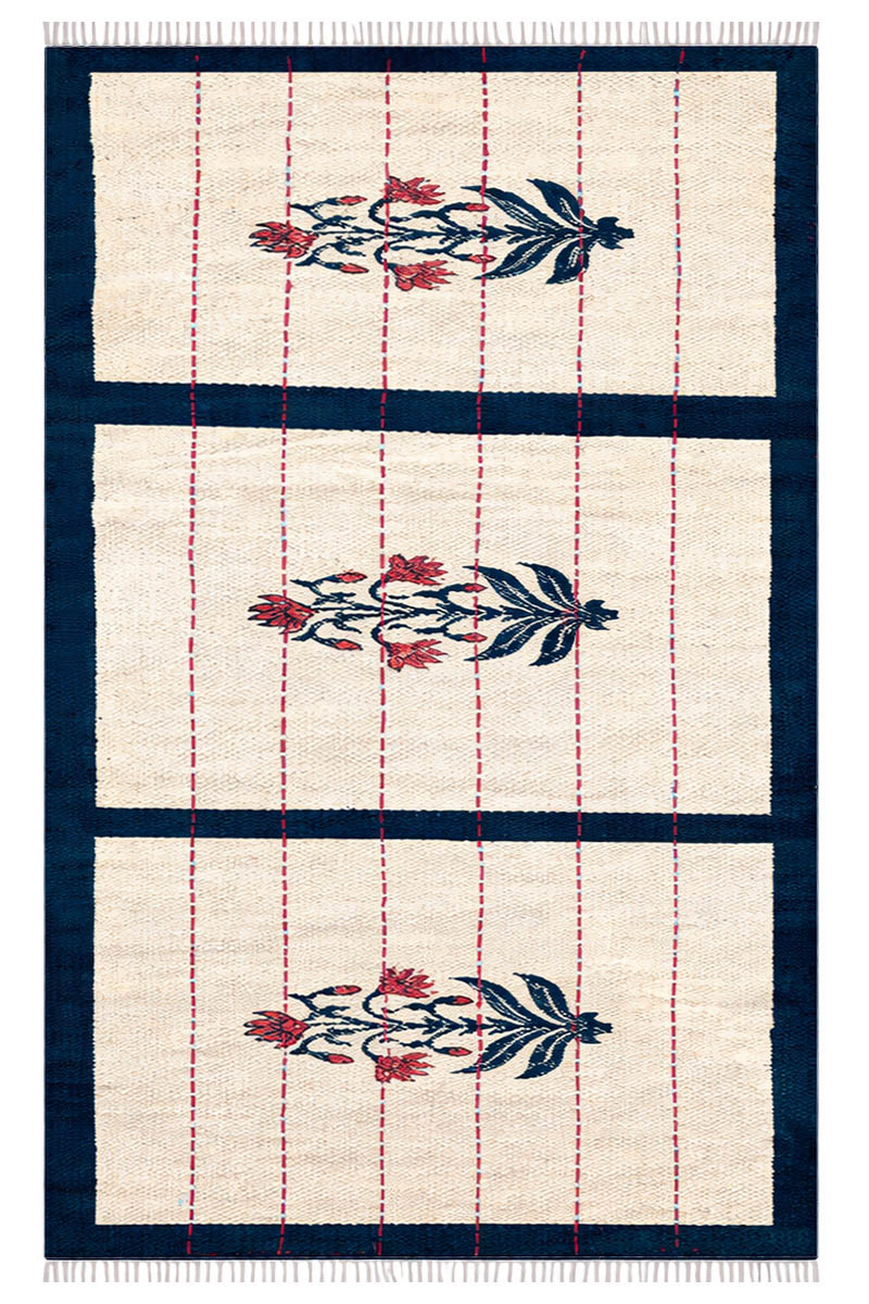 Bring the elegance of nature into your abode with the elegant flora pattern of our Gorgeous Floral Rug. An ingenious blend of history and modernity, this rug boasts of three exquisite plant patterns that are framed in a majestic blue color. The stark juxtaposition between the rich navy blue edges and the soft off-white panels is complemented with vertical lines of intricate red Kantha hand-stitching. Our Modern Boho Dhurrie rug acts as an elegant centerpiece for master suites, formal dining rooms, or modern entrances.