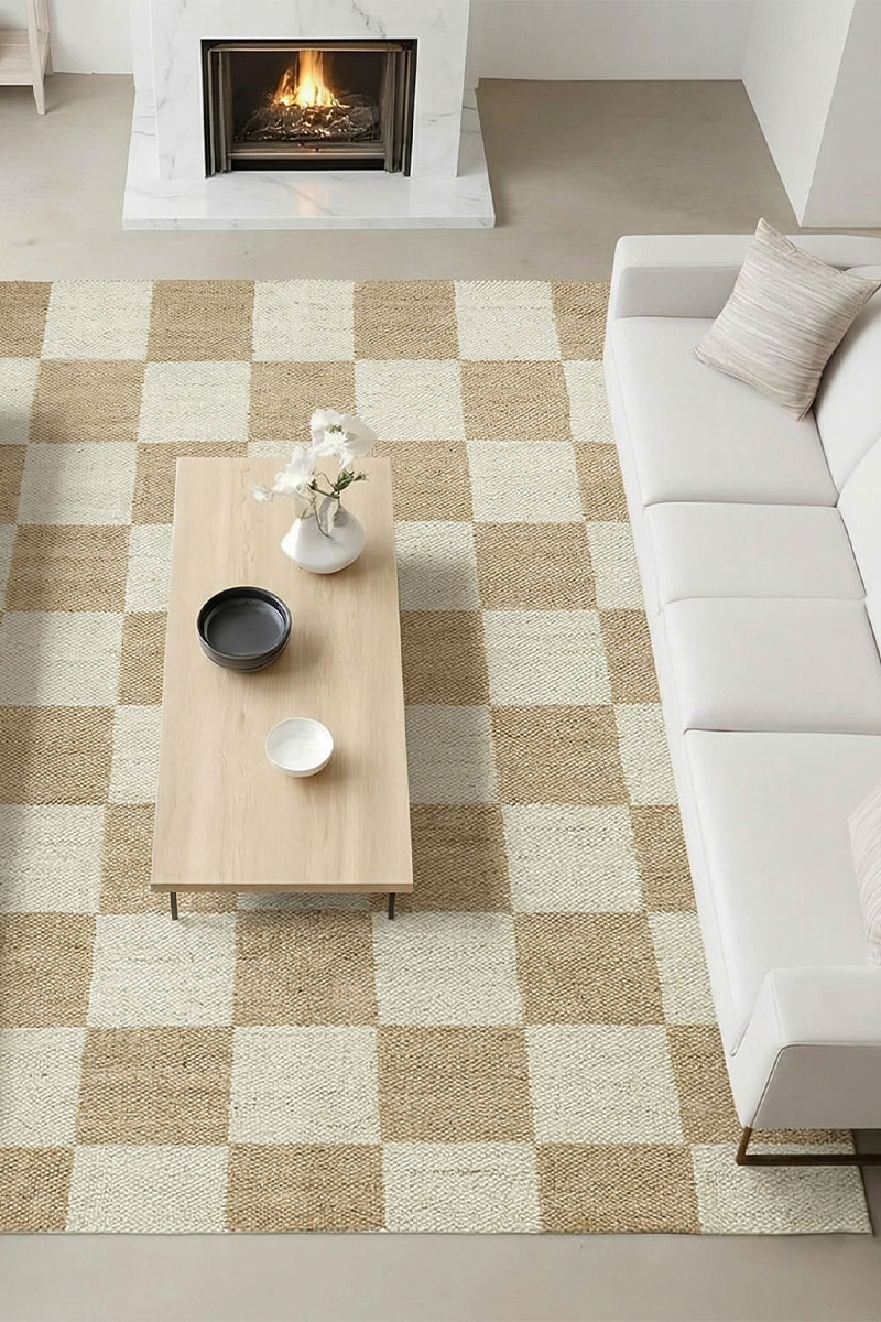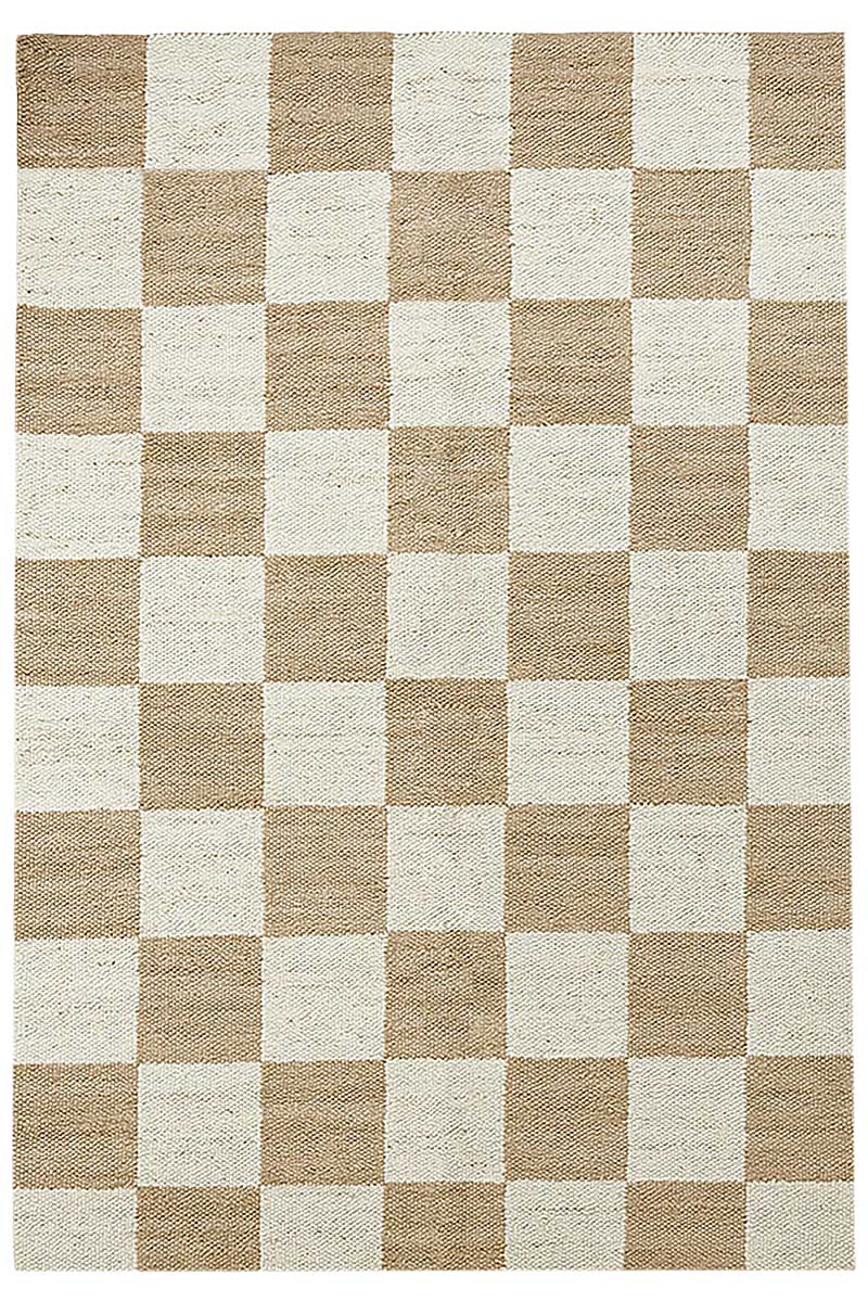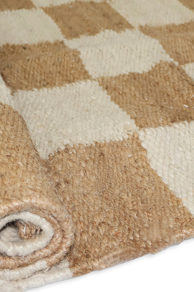 Add bold elegance to your space with this striking Beige and ivory checkerboard Hand Woven Rug. . Expertly crafted from premium natural fibers using traditional techniques, this reversible Modern Boho Dhurrie offers excellent durability and artisanal texture for high-traffic areas.