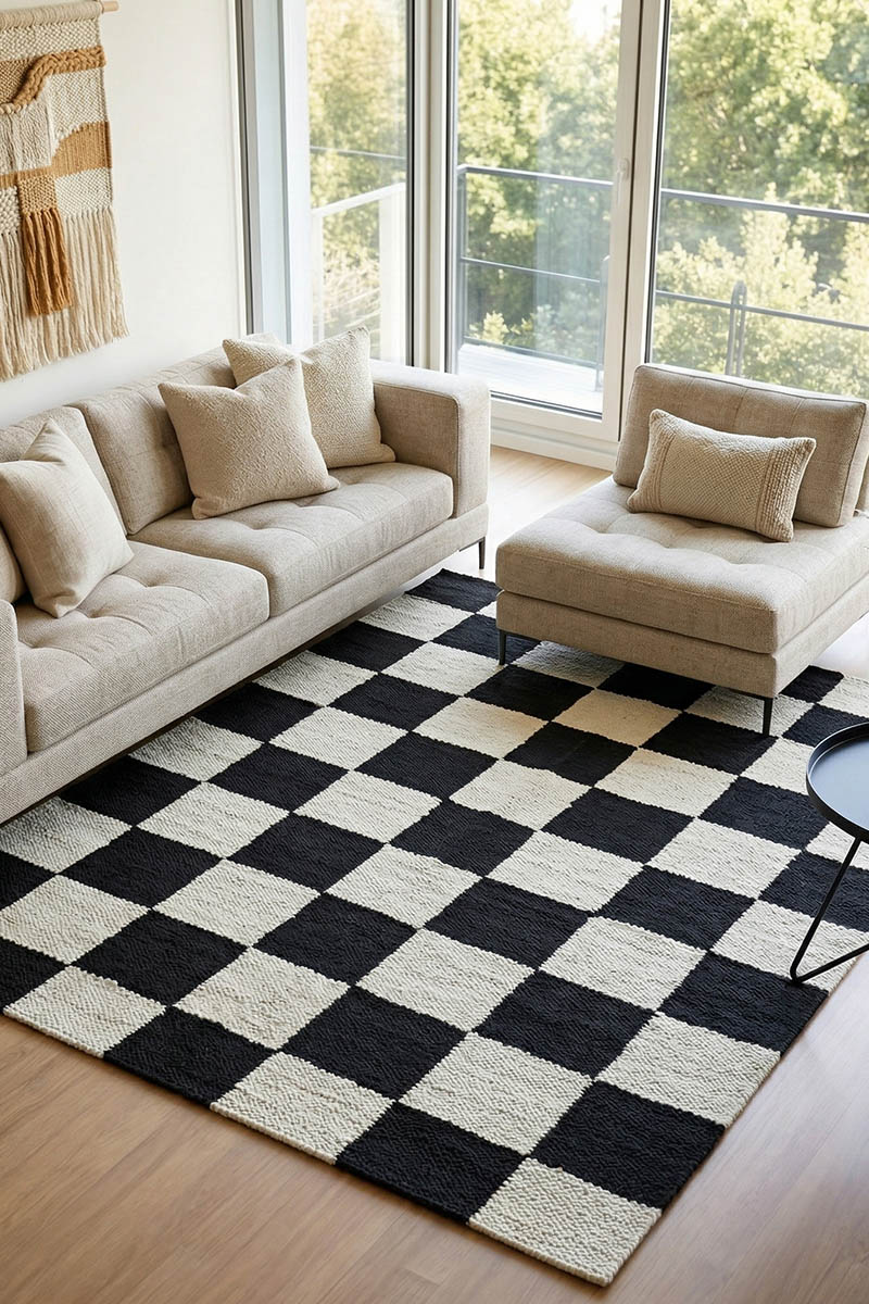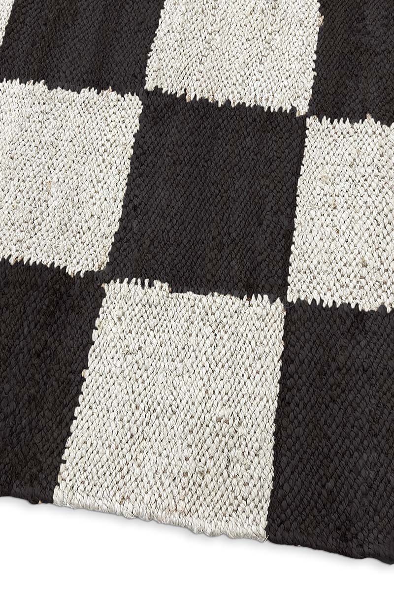 Add bold elegance to your space with this striking Black and ivory checkerboard Hand Woven Rug. . Expertly crafted from premium natural fibers using traditional techniques, this reversible Modern Boho Dhurrie offers excellent durability and artisanal texture for high-traffic areas.